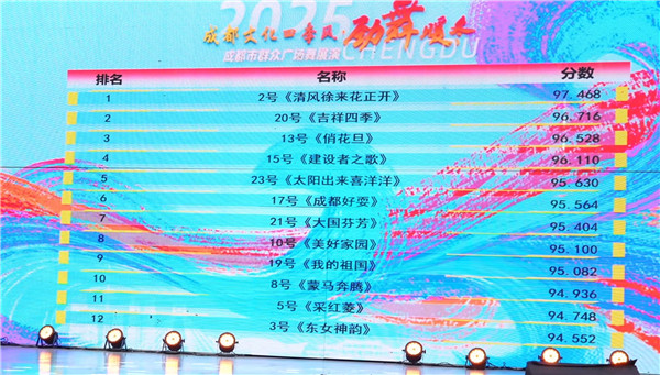 新都区文化馆精心组织编排的节目《清风徐来花正开》以独特的编排和精湛的表演,从众多优秀作品中脱颖而出,一举拿下97.468的全场最高分。该作品“将传统元素与现代审美巧妙融合,展现了广场舞艺术发展的新高度”。